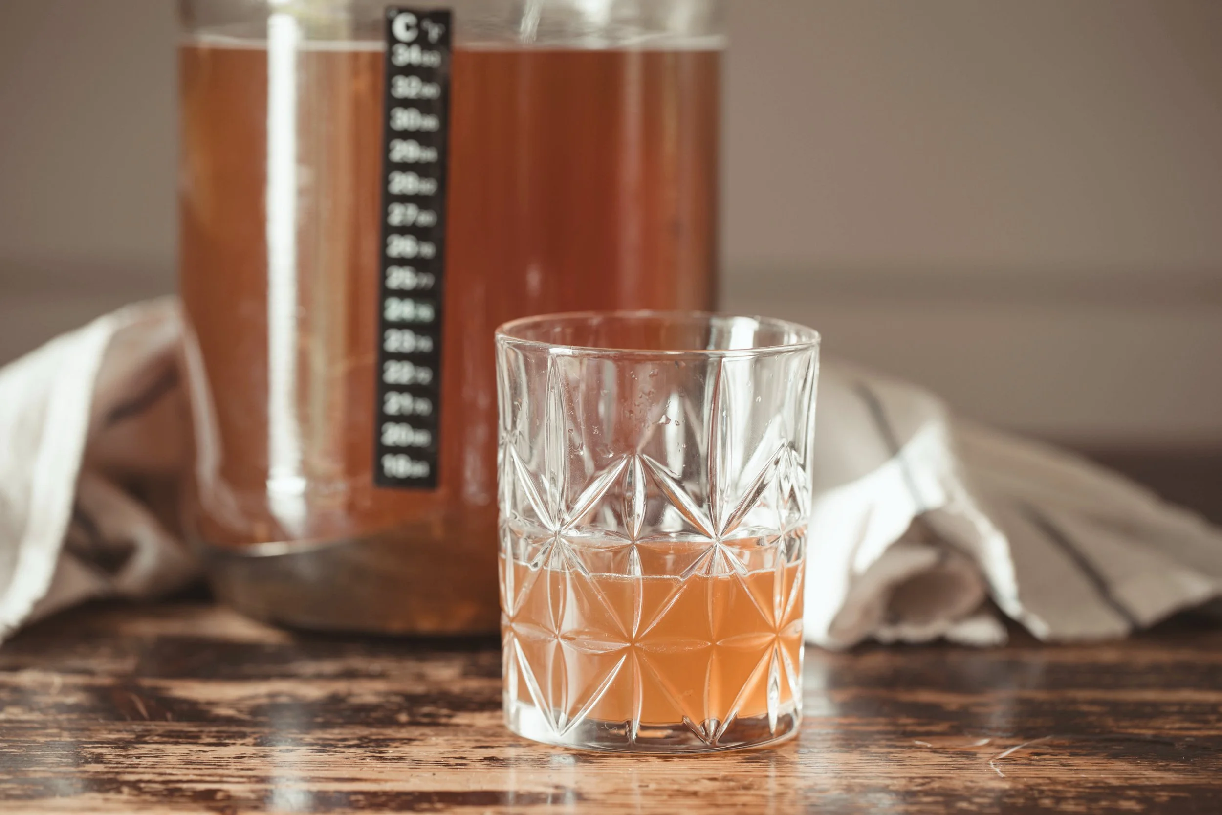Laita lasiastia lämpimään ja pimeään paikkaan. Lasiastiassa on hyvä olla lämpömittari, jotta pystyt seuraamaan kombuchan lämpötilaa. Paras lämpötila on noin 22-27 asteen välillä. Kylmemmässä fermentaatio tapahtuu hitaammin ja kuumemmassa taas nopeammin, joten ota tämä huomioon.