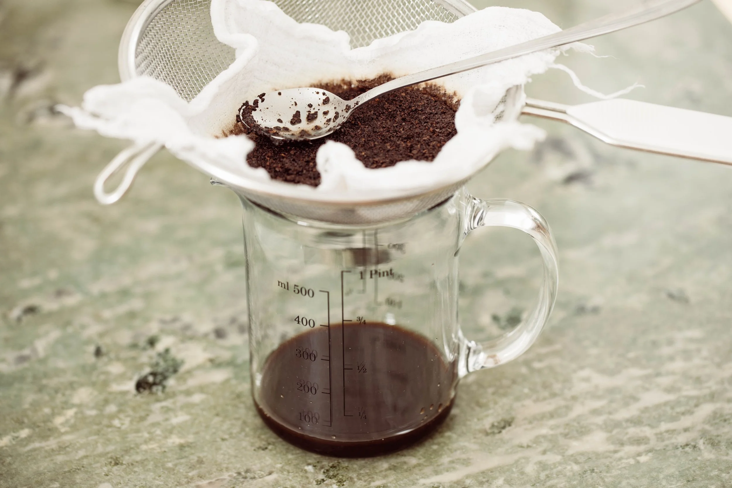 Kun öljy on uuttunut tarpeeksi kauan joko kylmäuuttamalla tai vesihauteessa, siivilöi kahvinporot pois öljystä. Voit siivilöidä joko tiheällä siivilällä tai puhtaan luonnonkuituisen harsokankaan avulla. Viritä tällöin harso kuminauhan tai narun avulla puhtaan purkin suuaukkoon ja kaada öljy hiljalleen kankaan läpi.